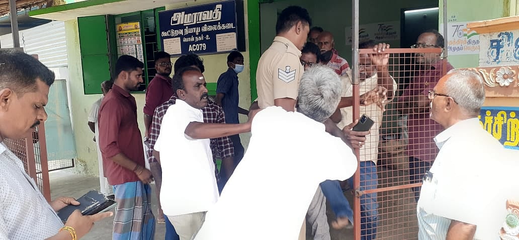 தமிழகத்தில் உள்ள அரசு அலுவலகங்களில் பிரதமர் மோடியின் புகைப்படத்தை, பாஜக-வினர் மாட்டி வருவதும், அதையொட்டி எழும் சலசலப்புகளும் நாளுக்கு நாள் அதிகமாகி வருகின்றன. அந்தவகையில், திருச்சி பொன்னகரில் உள்ள அமராவதி கூட்டுறவு நியாய விலைக்கடையில், பாஜக மண்டல தலைவர் பரமசிவம் தலைமையில் வந்த பாஜக-வினர் பிரதமர் மோடியின் படத்தை மாட்டியுள்ளனர். இதற்கு அங்கிருந்த திமுக-வினர் எதிர்ப்பு தெரிவித்துள்ளனர். இதற்கிடையே 55-வது வார்டு திமுக கவுன்சிலர் ராமதாஸ் சம்பவ இடத்திற்கு வந்து, ``அனுமதி வாங்காம மோடி படத்தை எப்படி ரேஷன் கடையில மாட்டலாம்!” எனக் கேள்வியெழுப்ப, இரு தரப்பிற்கும் இடையே வாக்குவாதம் உண்டானது.